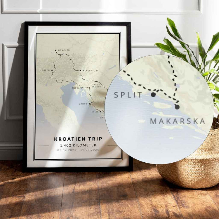 Das hängt von der Größe des Raumes und der verfügbaren Wandfläche ab. Kleinere Formate eignen sich gut für engere Räume oder als Teil einer Bilderwand, während größere Formate in großen Räumen oder als einzelnes Highlight wirken. - Wie kann ich ein personalisiertes Reiseposter am besten präsentieren?